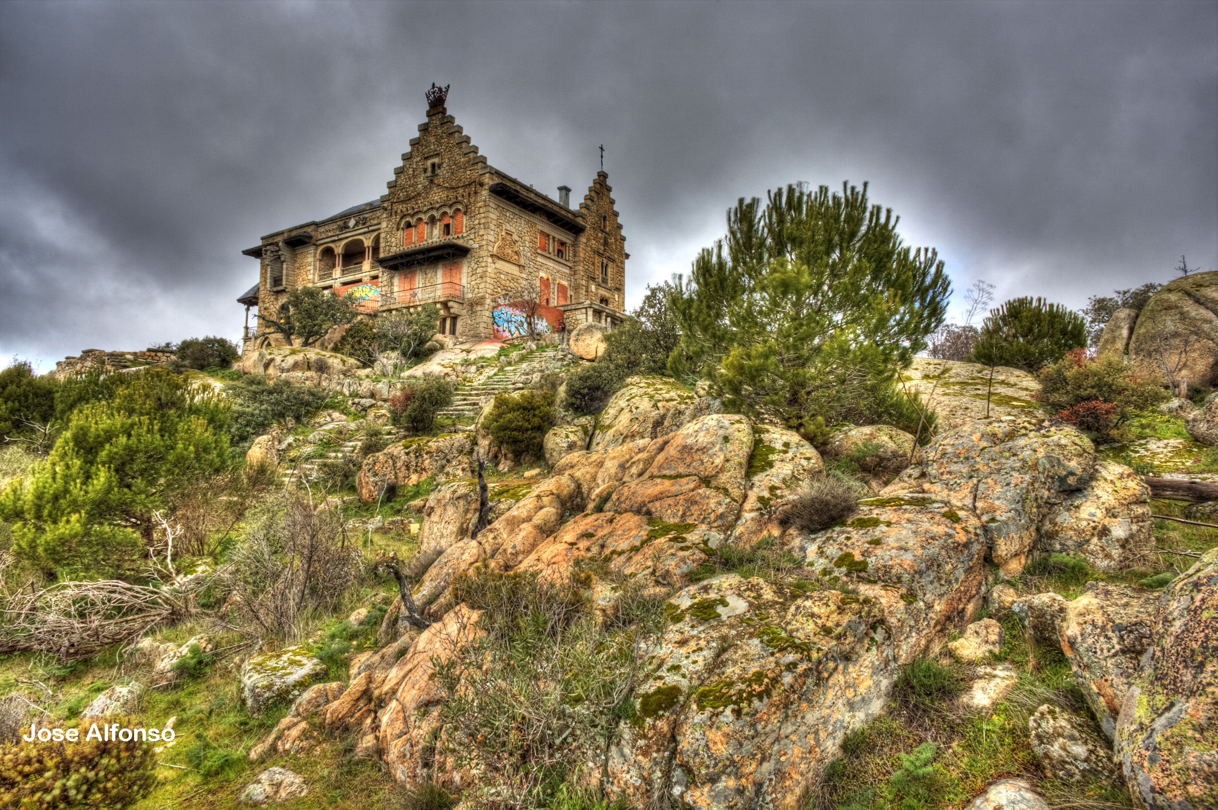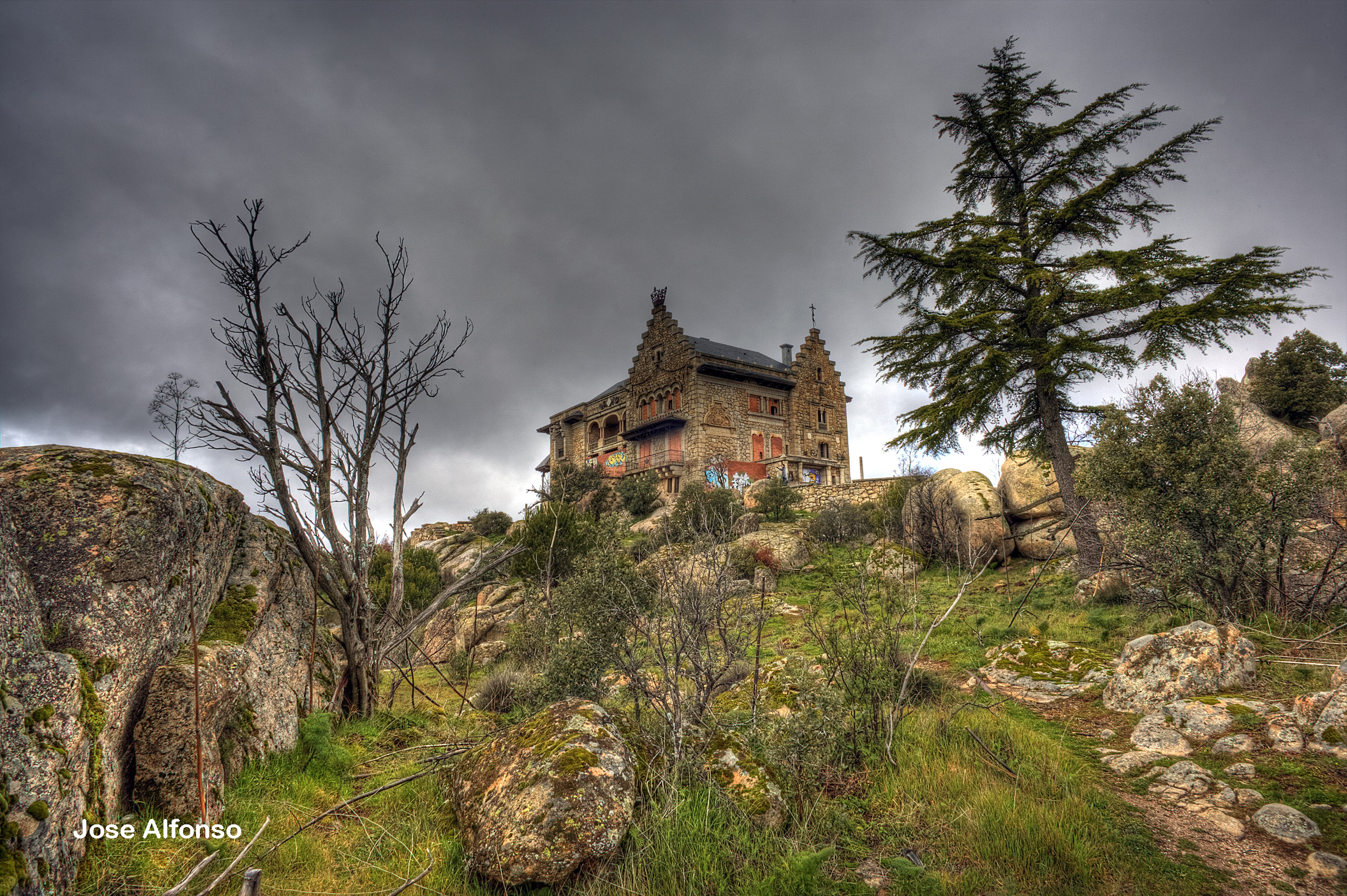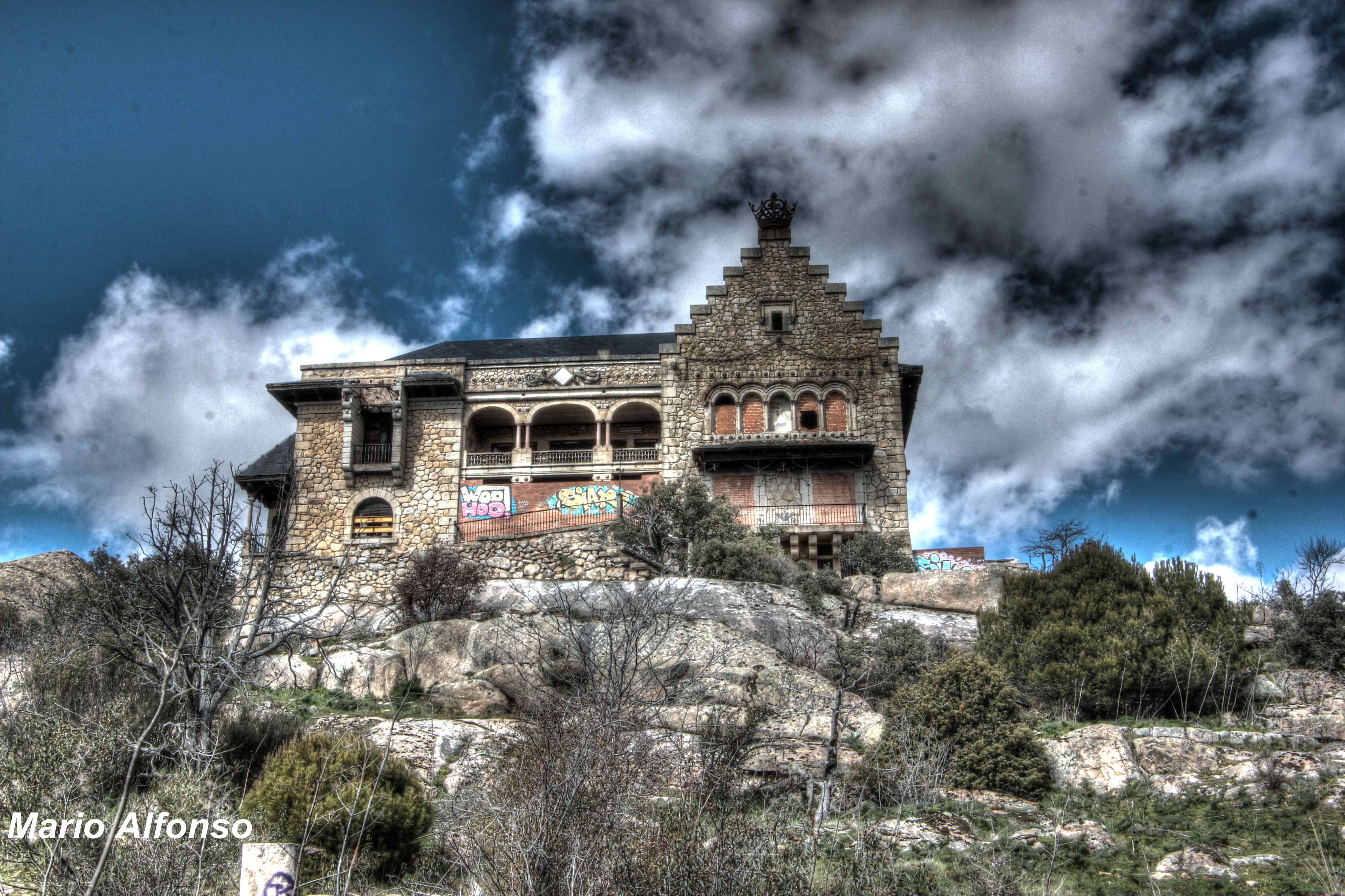 Si circulas por la A-6 dirección Coruña a mano derecha y a la altura de Torrelodones de ve en los alto de cerro. Es un precioso palacete completamente solitario y aislado.
